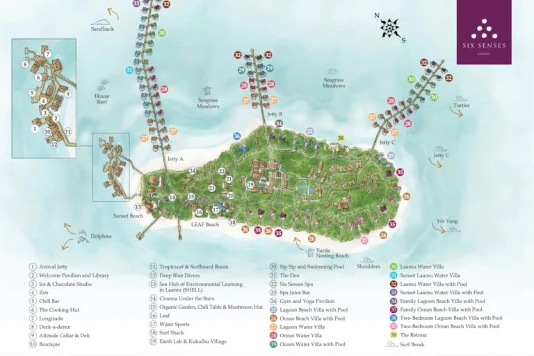 Das Six Senses Laamu liegt im Süden der Malediven im weitgehend unberührten Laamu-Atoll. Die Anreise erfolgt von Malé per Inlandsflug nach Kadhdhoo (ca. 50 Minuten), gefolgt von einem kurzen Bootstransfer zur Insel.